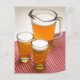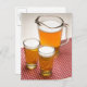 Asset ID: 73092739 / Barry Wong / Pitcher of beer and two glasses filled with beer on checkered table cloth, close-up