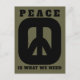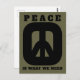 Postcard military green with black peace sign and "PEACE IS WHAT WE NEED" and Y-NOT-ME. In the long run fairness and equality are what brings peace. It seems that the more billionaires there are, the less equality there is. Is that just a coincidence?