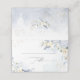 PixDezines place card, featuring watercolor blue hydrangea, alabaster n dusty blue roses and white with springs of gum eucalyptus and greenery; a faux gold dust, accented with luxury calligraphy script. All elements editable and removable.