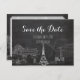PixDezines save the date with Paris cityscape sketched in white on chalkboard.