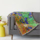 A quality printed throw has its advantages. This is a much finer weave throw than its loopier cousins, and though lighter, it is worth the investment for custom room accessorizing. The back is much prettier than the typical brown, and the fringe on the long sides very vivid, the selvage nicely done. Before photographing, I washed the throw in cold water, delicate, with a thicker woven throw the same size. On tumble dry low, this throw was dry in half the time as the other. This is a very practical quality if you use throws for furniture covers or to wrap up in frequently. The sleekness of the fabric makes it a great layer for accenting or protecting without the feeling of sitting on too much stuff. Perfect for napping or when you feel a light chill coming on. The color printing is beautiful and on this fabric, matched the design and color of my Photoshop image. This is an advantage for blending room fabrics and colors. The fringe on the short sides prints the colors from the design image and therefore varies from the side fringe. I streaked a white fractal line through the plaid pattern to give the illusion of weaving. This printed as crisp as an illusory thread, and put some white in the short side fringe, showing another advantage of print vs loomed- for artistic purposes, line lines, detail, and color integrity can be planned and preserved. My loomed throws have color limitations and more of a needlepoint texture. Print throws reproduce an exact image. The throw felt a little stiff straight out of the package, but this went away in the first delicate wash. Of course I searched the wash water for ink or bleeding and there was none.
