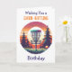 Birthday card for him. An ai illustration of a disc golf course with basket, pine trees and sunset in an 8-bit pixel art gaming vibes style.