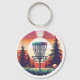 An ai illustration of a disc golf course with basket, pine trees and sunset in an 8-bit pixel art gaming vibes style.