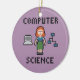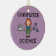 Illustration in 8 bit style depicting a female computer scientist, a computer and a fluxogram.