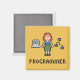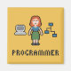 Pixel art illustration portraying a female programmer, a computer and a fluxogram.