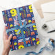 Modern text and pixelated graphics alien monster personalized age birthday gift wrapping paper, featuring graphic typography and your own name in orange, blue, gray, white and yellow. Personalize with your own name (please note not all names will fit due to the nature of the font) and age, currently reads Nathan 9, other name lengths are available, if you need assistance please contact me. Other matching items are available. Uniquely designed by www.mylittleeden.com only on zazzle.
