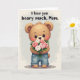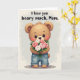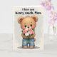 This card shows a pixel-style illustration of a small, teddy-bear-like creature in warm brown tones, with round ears, a tiny dark nose, rosy cheeks, and big shining eyes that seem to gaze forward with gentle affection ❤️. It stands calmly in blue denim trousers with visible stitching and slightly rolled cuffs, giving it a cozy, down-to-earth look. In its paws, it holds a bouquet of pink and white roses nestled in leafy green stems, arranged as if being offered to someone close. The soft contrast between the muted brown fur and the brighter flowers adds a quiet romantic touch, like a shy gift shared between friends or loved ones. Centered near the top, a short message appears in chunky pixel lettering, set in a dark tone that stands out clearly against the pale background. The pixel texture carries through the creature, the petals, and the leaves, creating a nostalgic, game-like look without losing the tender mood 🌼. Behind everything is a light grayish-white background with faint speckling and a soft, airy texture.