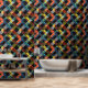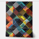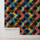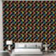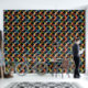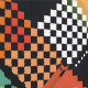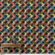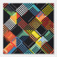 This artwork features a dynamic and colorful patchwork pattern composed of pixelated, checkerboard-like squares and rectangles. The design is a vibrant mix of colors including reds, yellows, blues, and greens, set against a stark black background. The pixelated elements overlap and intersect, creating a sense of depth and movement within the composition. The combination of geometric forms and bright colors, along with the digital pixelation effect, gives the artwork a modern, tech-inspired aesthetic while also resembling a traditional quilt pattern.
