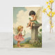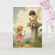 On the front of the card two small, winged children share a quiet moment in a spring meadow, their faces turned toward each other with a gentle, trusting look 💚. One child with dark curls wears a soft green ruffled skirt and sits on a worn stone pedestal, leaning forward as if letting the other in on a secret. Between tiny fingers, a four-leaf clover is held close, and the downward gaze makes the find feel tender and shared. Below, a blond companion in a rose-pink, tiered dress looks up with an open expression and reaches out a green sprig like a sweet offering ☘️. The light is soft and hazy, washing the scene in pale greens, blush tones, and creamy sky color, with distant mountains fading into the background. St. Patrick’s Day greeting text sits near the top in a deep green, with a smaller line beneath it in lighter green for balance. Yellow wildflowers dot the grass in the foreground, and the stone pedestal shows faint cracks and weathered edges.