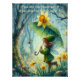 Whimsical watercolor illustration of a cute pixie in a green raincoat holding an umbrella in a rainy forest. A delicate butterfly flutters nearby, seeking shelter under the umbrella with the pixie. Surrounded by blooming daffodils, the enchanting woodland scene captures the charm of spring rain and magical creatures by martinspixs, with the saying "if you like the flower pick it, if you love the flower water it"