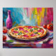 A fun and playful modern painting of a pizza, featuring textured abstract brushstrokes in bright colors such as pink, yellow, and blue. The bold colors and lively brushwork give the pizza a whimsical, energetic vibe, blending food imagery with a creative, contemporary art style. This quirky piece brings together pop culture and abstract expressionism, adding a touch of humor and fun to any setting.