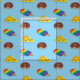 Cloth design with a collection of swimming pool floats arranged in a pattern. They consists of Popsicle ice cream pop in rainbow shades, a chocolate frosting doughnut with rainbow sprinkles and a slice of pizza topped with salami, mushrooms and capsicum.