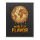 Cartoon Earth as a giant dripping pizza, with distressed text: “World of Flavor.”
