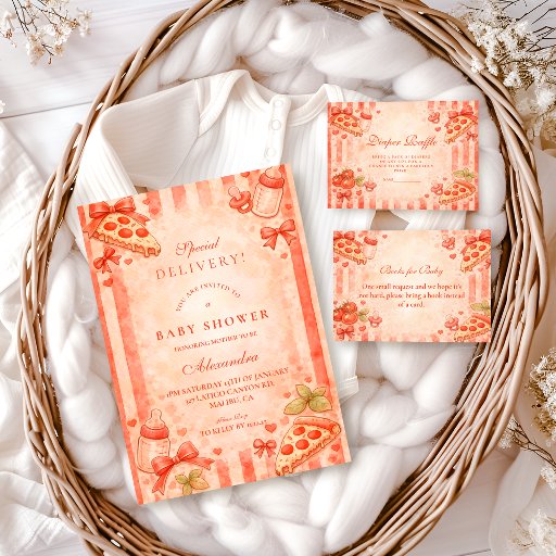 Celebrate the upcoming arrival with a playful Special Delivery baby shower design inspired by everyone’s favorite comfort food. This whimsical illustration features hand-drawn pizza slices, baby bottles, bows, and hearts in a warm tomato-red palette, arranged in a charming storybook-style frame. Perfect for parents who love fun, food-themed celebrations with a cozy, modern twist. Easily personalize all text to create a memorable design that feels joyful, unexpected, and full of personality.