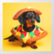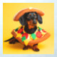 A charming dachshund sits proudly against a vibrant yellow backdrop, sporting an adorable pizza slice costume. The costume features a crust collar, complete with felt toppings like pepperoni, mushrooms, and cheese. The dog's ears peek out from under a matching pizza crust hat, adding to the overall cuteness.