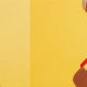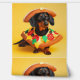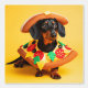 A charming dachshund sits proudly against a vibrant yellow backdrop, sporting an adorable pizza slice costume. The costume features a crust collar, complete with felt toppings like pepperoni, mushrooms, and cheese. The dog's ears peek out from under a matching pizza crust hat, adding to the overall cuteness.