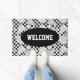 Cool black and white checkered welcome mat printed with hand drawn pizza slices and herbs. Perfect doormat for Italian restaurants, pizza parlors, trattorias and pizza chefs' homes