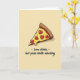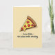 This card shows a single slice of pizza centered on a warm beige background, turning comfort food into a funny Valentine’s moment 💘. The slice has golden-yellow cheese, a toasted brown crust, and a little drip of melted cheese hanging from the point. On top, there are several red heart-shaped toppings that look shiny and sweet, like little love notes. The whole drawing has a simple cartoon look with dark outlines that make the colors stand out. Below the pizza, the card reads “— Love stinks, — but pizza smells amazing” in a casual hand-lettered style, placed near the bottom. The text is easy to read and matches the light, teasing mood of the picture 😘. It’s a great pick for someone who likes romance with a side of humor and snacks ❤️.