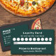 For your pizzeria restaurant, food truck, home delivery food service or cooking chef, this classy loyalty card will be perfect. It comes with a half of a Margherita pizza placed on a wooden board and customizable information decorated with icons on a dark green background.