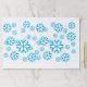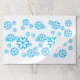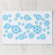 Snowflakes in multiple sizes are jumbled in various positions on the place mat. Blue on white background.