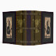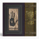 This amazingly detailed antique Grimoire Binder is a cured leather print. Leather straps stretch across the spine. The center has aged symbols and the necrotic grasp in the, the hand print of the necromancer.