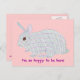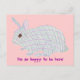 Cute colorful line drawing of a happy bunny rabbit in plaid, known as Plaid Bunny, printed on postcards. Plaid Bunny says, "I'm so hoppy to be here!" Choose your own background color. To choose a different background color, click on Customize It, then on Edit, then on Background, and then on the color of your choice.