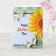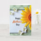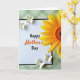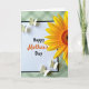 This card features a white rectangular panel with a thin black border, centered on a soft muted green background patterned with a gentle diagonal plaid. The greeting “Happy Mother’s Day” sits in the middle, with most words in black and “Mother’s” highlighted in warm orange to draw the eye. In the upper right, a large yellow flower opens toward the message, its textured center filled with layered earthy tones that feel sunny and welcoming. Four small creamy-white winged insects float around the design, adding a light, affectionate energy like little companions circling close ❤️. Two hover near the upper left area of the panel, as if drifting in to admire the words, while the other two settle near the lower right for a balanced layout 🌼. The soft green backdrop keeps everything calm and cozy, letting the warm yellow and orange accents read as a gentle, caring touch. The upper-right bloom shows broad golden petals around a dense, speckled center in warm browns and oranges.