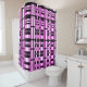 This shower curtain features a modern twist on plaid in shades of pink, gray, black and white.