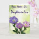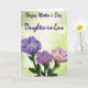 This card shows a gentle floral scene that feels like a quiet hug between close friends ❤️. Three blossoms take center stage, with a larger purple flower on the left whose petals fade from lavender edges into a pale center around a golden-yellow core. Two smaller blooms sit to the right in soft pink and light lilac, their slightly ruffled petals leaning toward each other as if sharing a secret. Deep green stems and leaves gather beneath them, adding a grounded contrast and guiding your eye upward. The background is a smooth green gradient sprinkled with softly blurred circular light spots, like sunlight filtering through leaves on a calm afternoon. Near the top, a short Mother’s Day message is placed in dark violet lettering, centered above the flowers and easy to read. A small 🌼 touch appears in the design through the warm yellow centers that glow against the cooler petal tones. The petals show fine shading and delicate highlights, and each flower has a distinct yellow center framed by pale white near the middle.