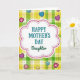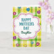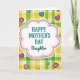 Designed with a soft, cloud-like white shape at the center, this card features a tender Mother’s Day message that feels close and affectionate ❤️. The main line, “HAPPY MOTHER’S DAY,” sits prominently in teal, using a simple, easy-to-read font across the middle of the white panel. Just below it, the word “Daughter” appears in dark green with smooth, flowing lettering, like a gentle sign-off from someone who cares. A double frame surrounds the center panel, with small pink dots forming an inner border and a thin white outline adding a neat edge. Behind the message, a spring plaid pattern fills the background with lime green, sunny yellow, and soft cream stripes, giving the scene a light, friendly energy 🌼. Scattered across the plaid are heart shapes that resemble little buttons or stickers, suggesting sweet keepsakes shared between family members. The hearts come in deep blue and purple, a bright red one marked with a white “X,” and a yellow heart with a simple smiling face, with some showing tiny button holes for extra detail. The pink dotted border repeats evenly around the central white panel against the lime-and-yellow plaid backdrop.
