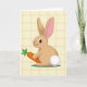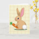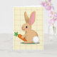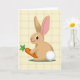This card features an upright, human-like rabbit centered in a simple digital illustration, wearing a light brown coat and turning slightly as it looks off to the left with a small, friendly smile 🐰. Its pink nose and rosy cheeks add a sweet, companionable look, and the long ears show soft pink on the inside, framing the face like a gentle hug. The rabbit holds an orange carrot close to its chest, the leafy green top fanning upward as if it’s being offered to someone special 🐇. Beneath its feet sits a small oval patch of deeper green, anchoring the figure like a little stage in a garden scene. The background is creamy yellow with a faint, woven plaid texture in pale beige, giving the setting a cozy, lived-in feel that hints at closeness and quiet affection. Soft, diffused light rounds out the shapes, highlighting the fluffy white tail and the crisp edges of the carrot. Any greeting text would sit neatly near the top in a warm, medium-toned color, leaving the rabbit and carrot clearly visible against the pale patterned backdrop.