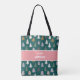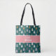 Custom all over print tote bag personalized with your monogram name and surname. This cute Christmas tree's design consists of a plaid and stripe patterned Christmas tree's pattern on a dark green background with a light red stripe crossing it. Simply edit the design by clicking on "personalize this template" and change the text. The text will change on both sides at the same time.