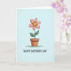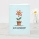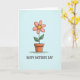 The front design shows a single flower centered on a pale blue background, drawn with soft, watercolor-like texture that feels gentle and affectionate ❤️. Six rounded petals in blush pink surround a warm yellow center, like a sunny face leaning in for a friendly hello. The bloom rises on a thin green stem with two leafy sides, giving the plant a cared-for, companionable look. It grows from a small terra cotta pot in earthy orange-brown, with light shading and tiny texture marks that suggest a cozy, lived-in surface. Below the illustration, the words “HAPPY MOTHER’S DAY” sit near the bottom in black lettering, spaced clearly so the art remains the focus. The lighting stays soft and even, with subtle pastel transitions that make the flower look tender rather than flashy 🌼. Fine, slightly uneven linework traces the petal edges, leaf veins, and the pot’s rim against the airy blue backdrop.