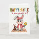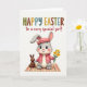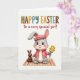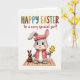 This card shows a softly shaded grey rabbit standing upright with an easy smile and a faint blush on its cheeks, giving it a friendly, affectionate look 🐰. The rabbit wears a light pink jacket with tiny buttons and a gentle plaid detail near the cuffs and lower edge, along with a matching cap topped by a small flower-like pin. In its left paw, it holds a small bouquet of sunny yellow, daisy-like blooms, angled as if being offered to someone close. Beside it sits a smaller chocolate-brown companion with a smooth, simple shape, positioned near the rabbit like a quiet friend sharing the moment 🐇. Both figures rest on a horizontally striped mat with muted beige, soft pink, and deeper brown bands, set against a wide white background that keeps the focus on their closeness. Across the top, the message “HAPPY EASTER to a very special girl!” is placed in a mix of bright, varied letter colors, with the main words larger and the rest slightly smaller beneath. The rabbit’s cap is tilted slightly forward, and the yellow flowers stand out sharply against the pale outfit and white space.