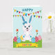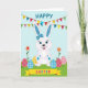 This card features an upright white bunny with long ears patterned in blue plaid, topped with a small matching bow that gives it a sweet, friendly look 🐰. Its big blue eyes and open smile, with a tiny pink tongue showing, feel like it’s sharing a cheerful moment with the viewer. Blue accents mark its feet, adding extra detail without crowding the character. Behind it, a light blue sky meets a wide stretch of green grass, setting a springtime scene that feels made for strolling side by side 🌷. Several decorated eggs rest in the grass, each covered in plaid designs in red, blue, yellow, and pink, as if placed for a gentle little search. Across the top, a string of small triangular flags runs left to right in mixed bright colors, framing the scene like a party banner. Large all-caps greeting text appears in a strong, dark color near the top and again near the bottom, with the bunny centered between the two lines. Small orange star-shaped flowers on thin green stems dot the foreground near the eggs.
