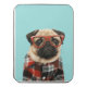 Pug in a plaid shirt and glasses.