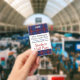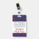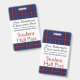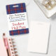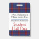 School teacher's student hall pass badge done in white with a red, white, blue and black plaid pattern, across the top and bottom. Personalize the text fields to read what you want.