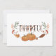 Thanksgiving greeting card with word "Thankful" in cute orange plaid with fall leaves and pumpkins. Add your own message to the back.