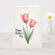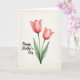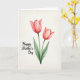 Designed with two stylized flowers as the main focus, this artwork shows slender green stems lifting softly closed petals in coral and blush pink, like a gentle pair leaning toward each other ❤️. The taller bloom sits slightly left of center, while the second tilts to the right, creating a quiet, companionable rhythm. Transparent watercolor-like layers give the petals subtle light-and-shadow shifts that feel tender rather than showy. Broad leaves and stalks in muted greens spread outward, adding a calm, natural setting around the blossoms. Near the lower-left area, a short celebratory phrase appears in a flowing, cursive-style font in a deep dark shade, sitting neatly against the pale background. The creamy off-white backdrop keeps the focus on the flowers, and the paper-like texture suggests soft grain beneath the paint 🌼. The two blossoms remain the clearest detail, with the left flower slightly taller and the right flower gently angled toward it.