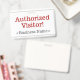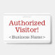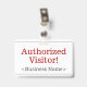 This plain badge design features the message "Authorized Visitor!", and a customizable company name or other custom message. It also features a double-line border. A badge like this could maybe be used to show that somebody at a business or workplace is an authorized guest or visitor. [~Z0000307]
