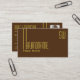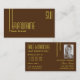 Make a lasting impression with this classic and simple business card design with modern yellow font & fine decor stripes, monogram and (employees-) photo on a plain dark brown background.