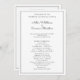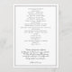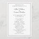 Plain white wedding program template with text on both sides. Size 5x7 sample design will fit on a few other sizes. White, flat cards have optional paper upgrades. Printed and handwritten script fonts are in black and both sides have thin black and gray lines around the edges to frame the text. Customize the title, include date and time of event, order of the ceremony, and list the wedding party. A template on the back can be used by the couple to write a personal message to guests. Or use the space to mention relatives who are no longer alive, but present in hearts. This is a simple, neutral program design which works for many kinds of marriage ceremonies.