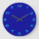 A plain large clock in royal blue, with aqua numerals. This striking clock will be a feature in your home, very bright and sunny.