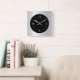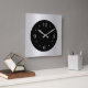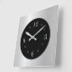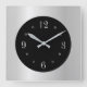 A simplistic wall clock with a background of silver effect and a black face. Complimenting this design are silver clock hands and Numerals.