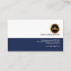 A simple design with a dual tone color background. The top blue portion has an abstract faux gold faucet logo with its business name underneath. The bottom white portion contains all the card's information. A small vertical white line sits in the middle of your name and job title on the left, against your contact details at the opposite end. Each detail is allocated a bullet point. Near the card's floor, you have a slogan tagline.