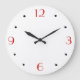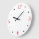 A very plain white round clock with Red Roman Numerals. Black clock hands and dots for other marker times.This clock can be customized to change size and colour. Available also in square form.