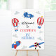 Blue, red with a touch of yellow how time flies first birthday welcome sign for a baby boy featuring some planes, hot air balloons and clouds.
