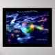 Poster with my digital artwork of the planet Earth in space surrounded by colorful auroras, stars and music notes with text "the day the Earth stops singing, we stop dancing".