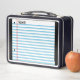 This is a standard metal lunchbox that appears to work just fine. We designed this box ourselves with an uploaded photo and custom text on the front and back. It looks absolutely beautiful except the front of the lunchbox is not centered like it shows in the photo. The print borders don't align with the inset flat part of the box where the preview photo online showed it perfectly centered in there. The back looks nice and centered though.