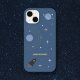 A space themed phone case for kids (or not) with planets, stars and a rocket in cartoon style on a blue background. It comes with a customizable forename: perfect for a gift to a child or a space lover!